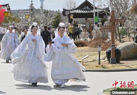 4月7日,在吉林省延吉市的中國朝鮮族民俗園內(nèi),游客身著朝鮮族服飾拍照!≈行律缬浾 張瑤 攝