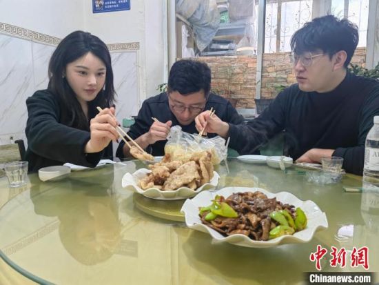 來自天津的游客趙瀟虹攜家人在吉林過年,一家人不僅品嘗鍋包肉,還對各餐館的鍋包肉進(jìn)行了對比!懊考也说奶攸c(diǎn)都不一樣,有的是酸甜口味占優(yōu),有的是肉片特別有嚼勁!